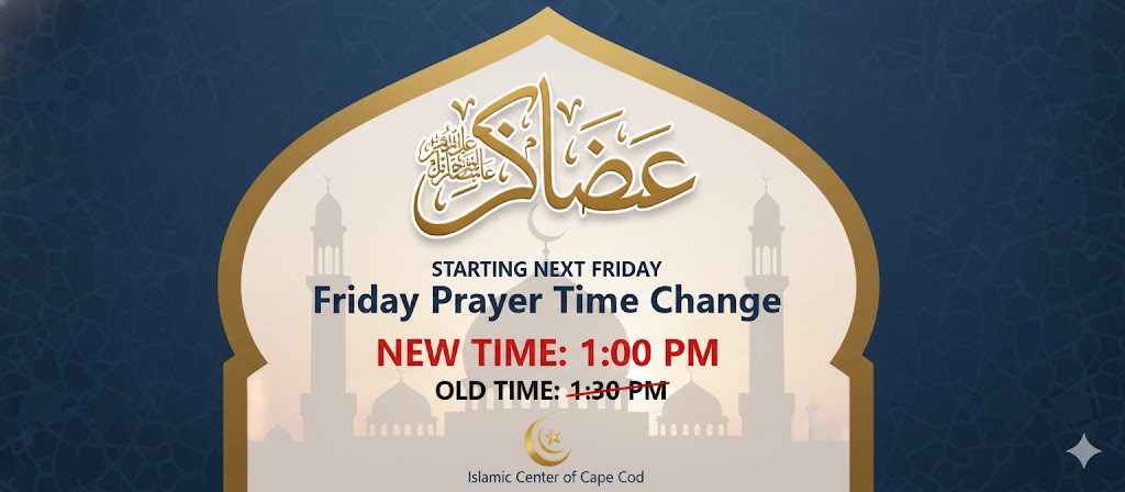 We would like to inform our community that starting next Friday, the Jummah (Friday) prayer time will be changing from 1:30 PM to 1:00 PM.